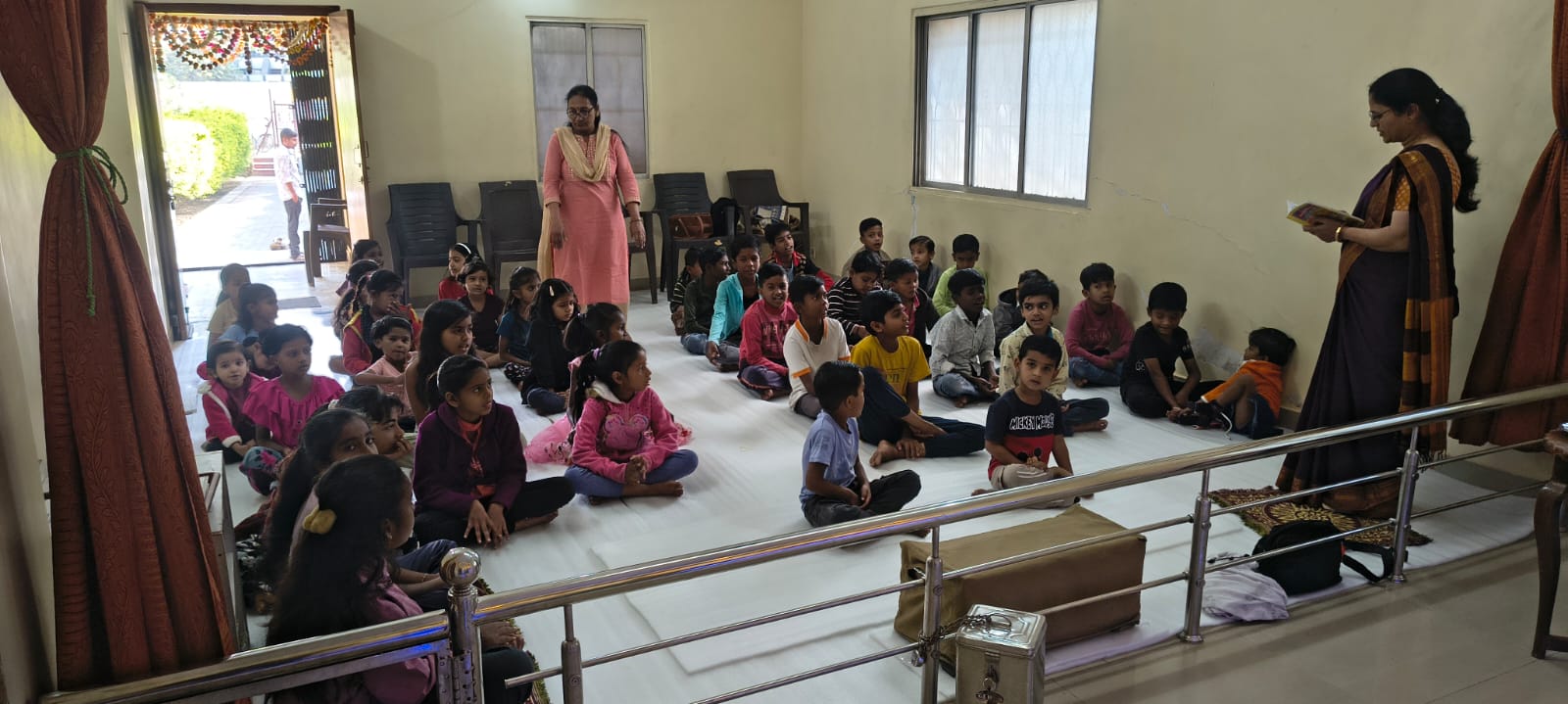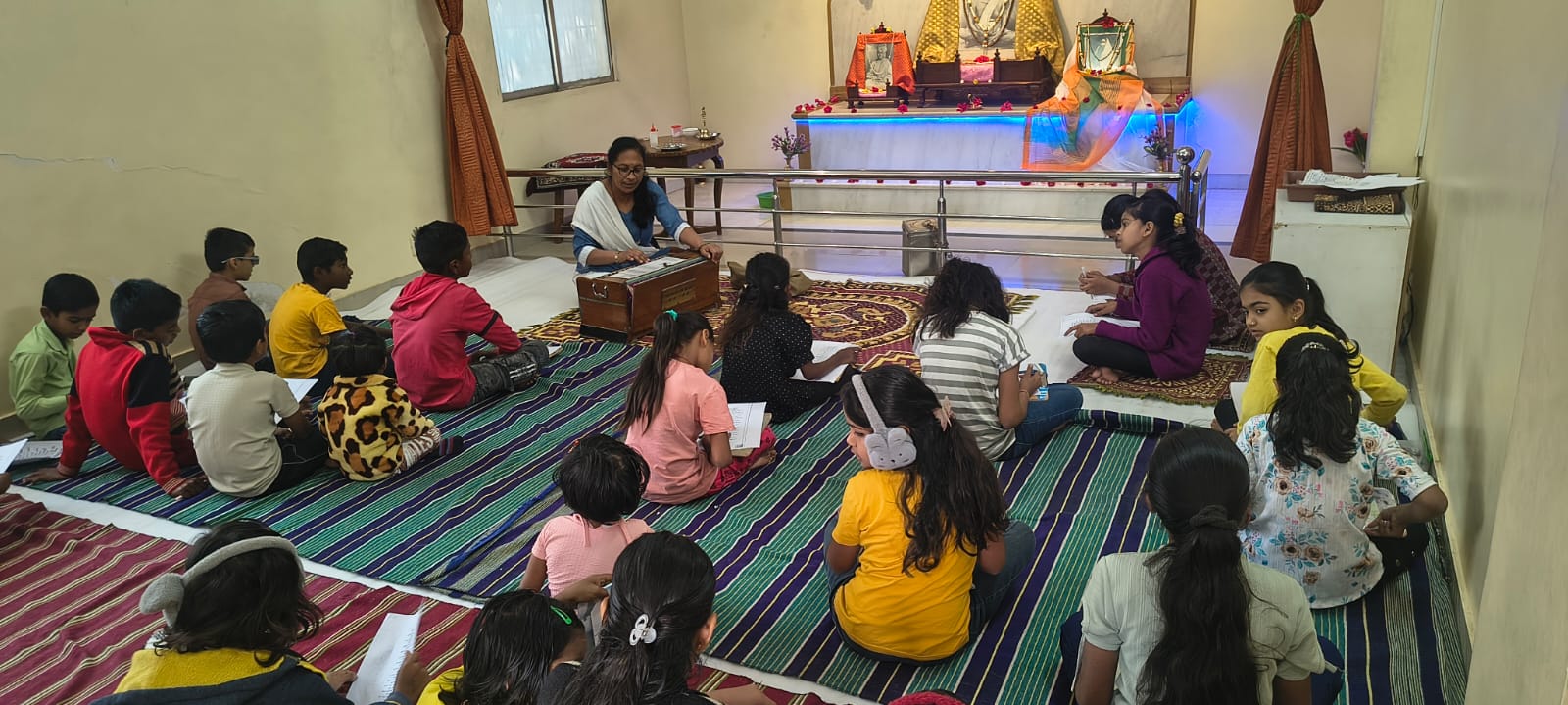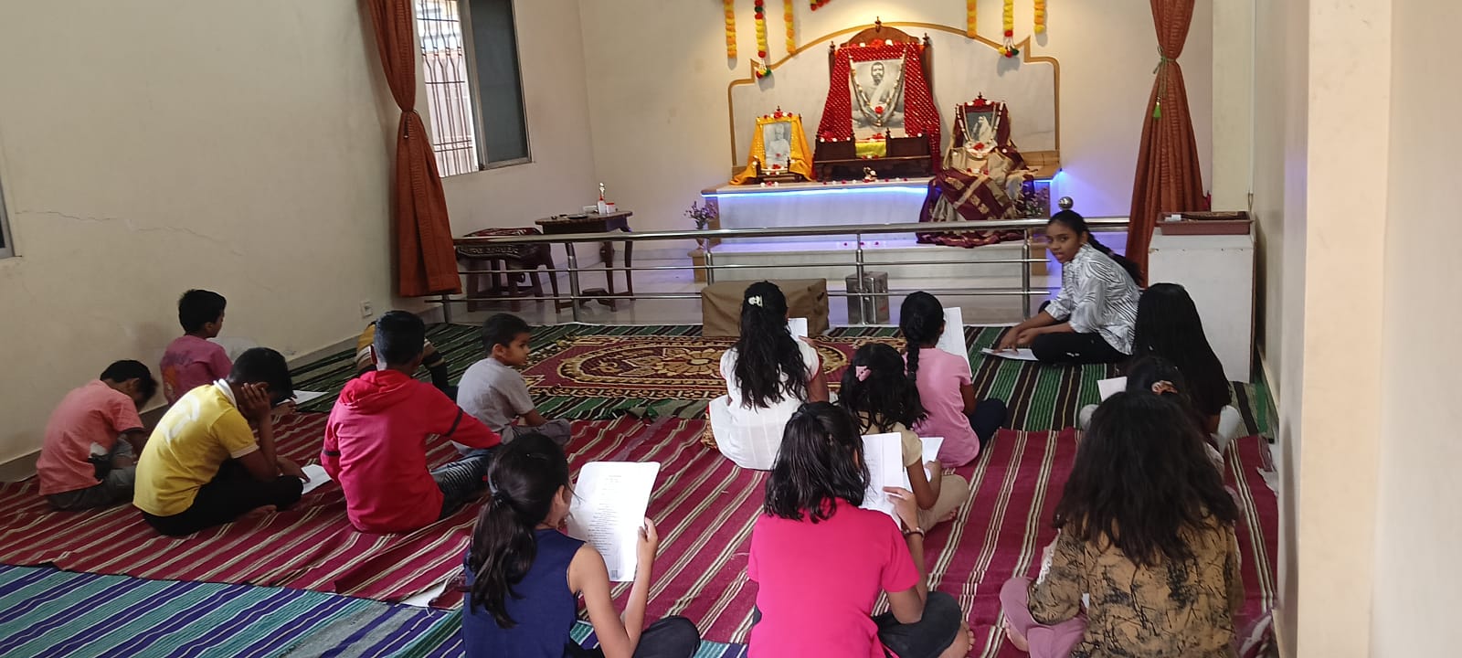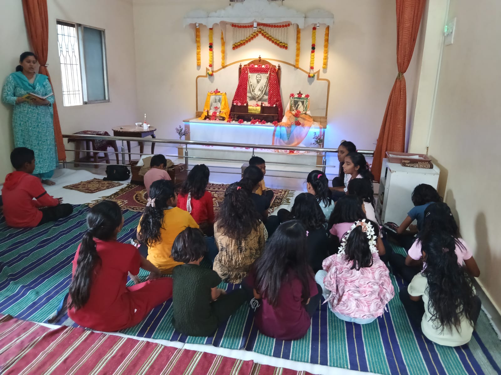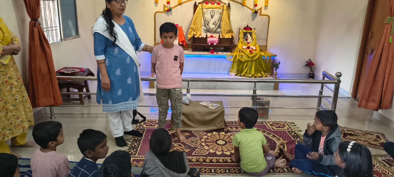 - Balak Sangha: For imparting moral and spiritual education to the school going children, the Balak Sangha of the Ashram holds classes for children on every Sunday morning. They are taught Chanting Hymns and Bhajans, Moral and Spiritual Story Telling, Yoga and Games etc. Children play dramas on the lives of Holy Trio on various occasions.