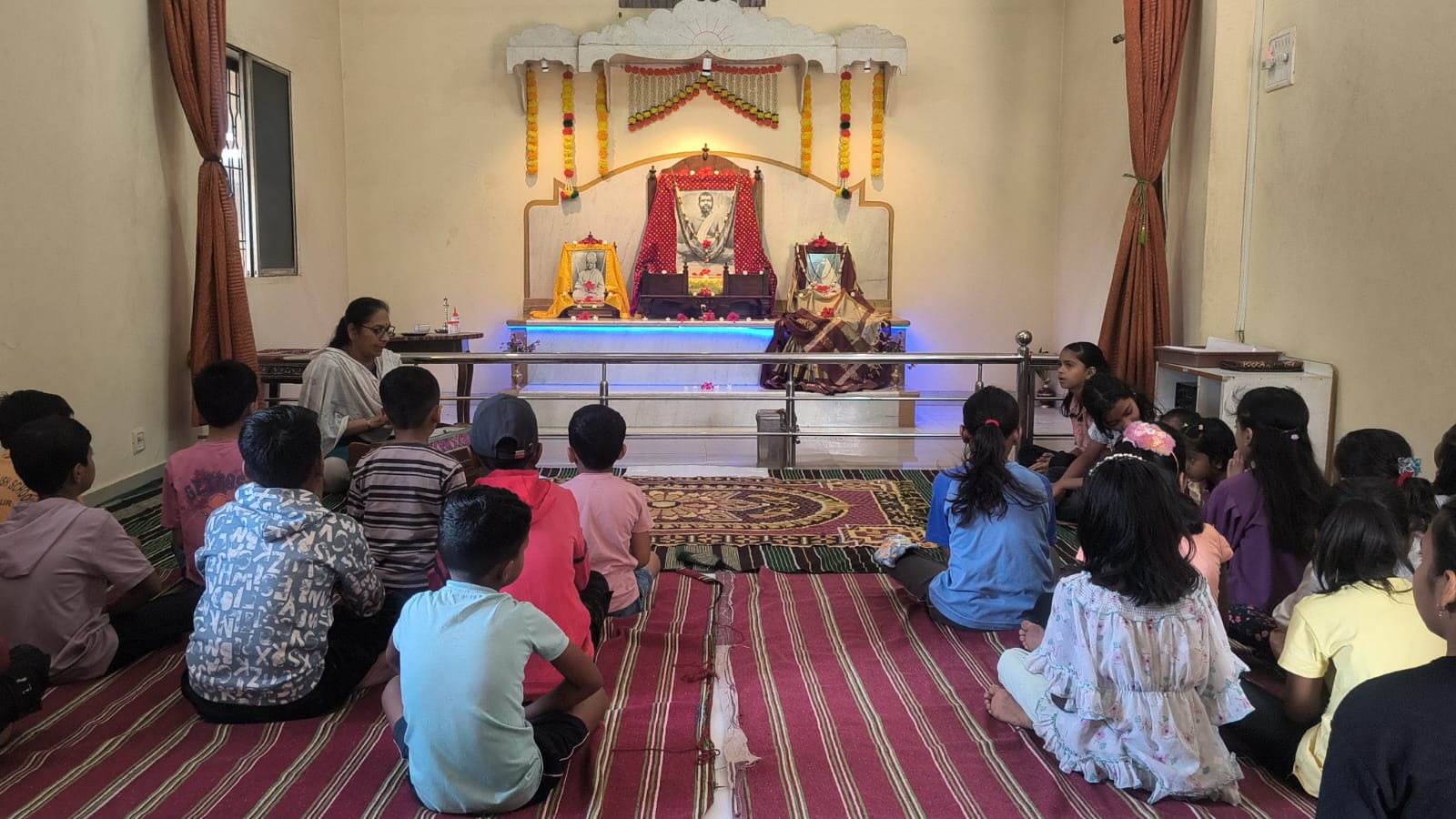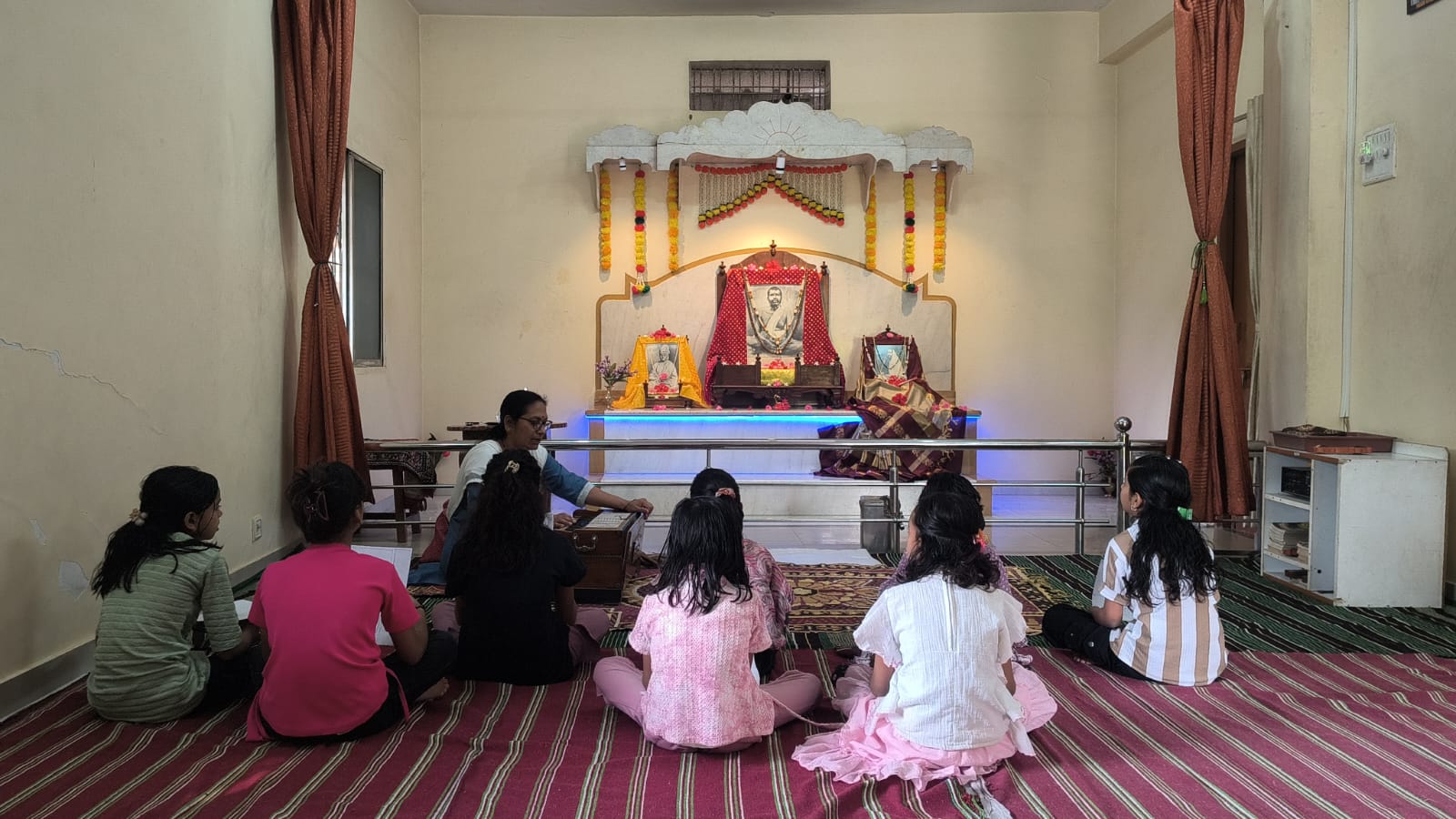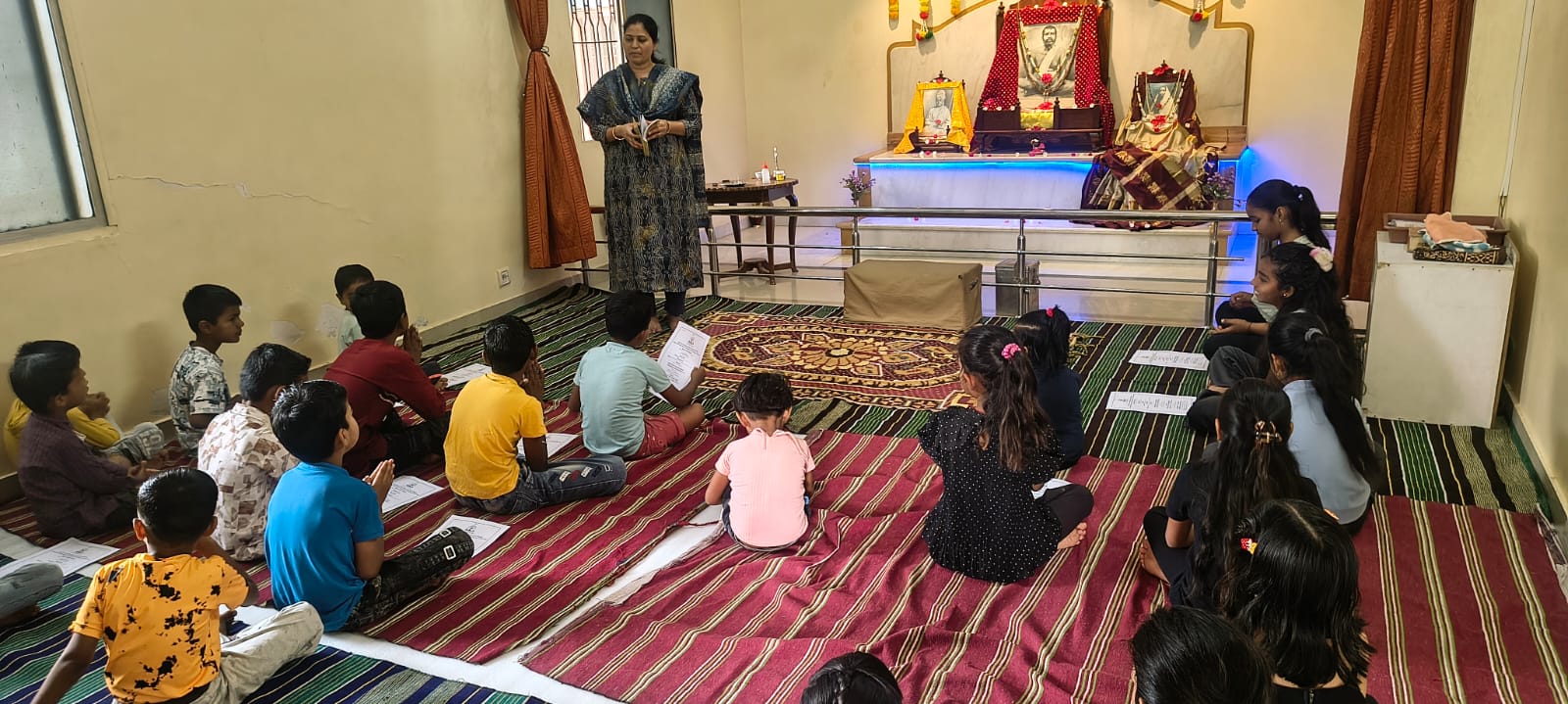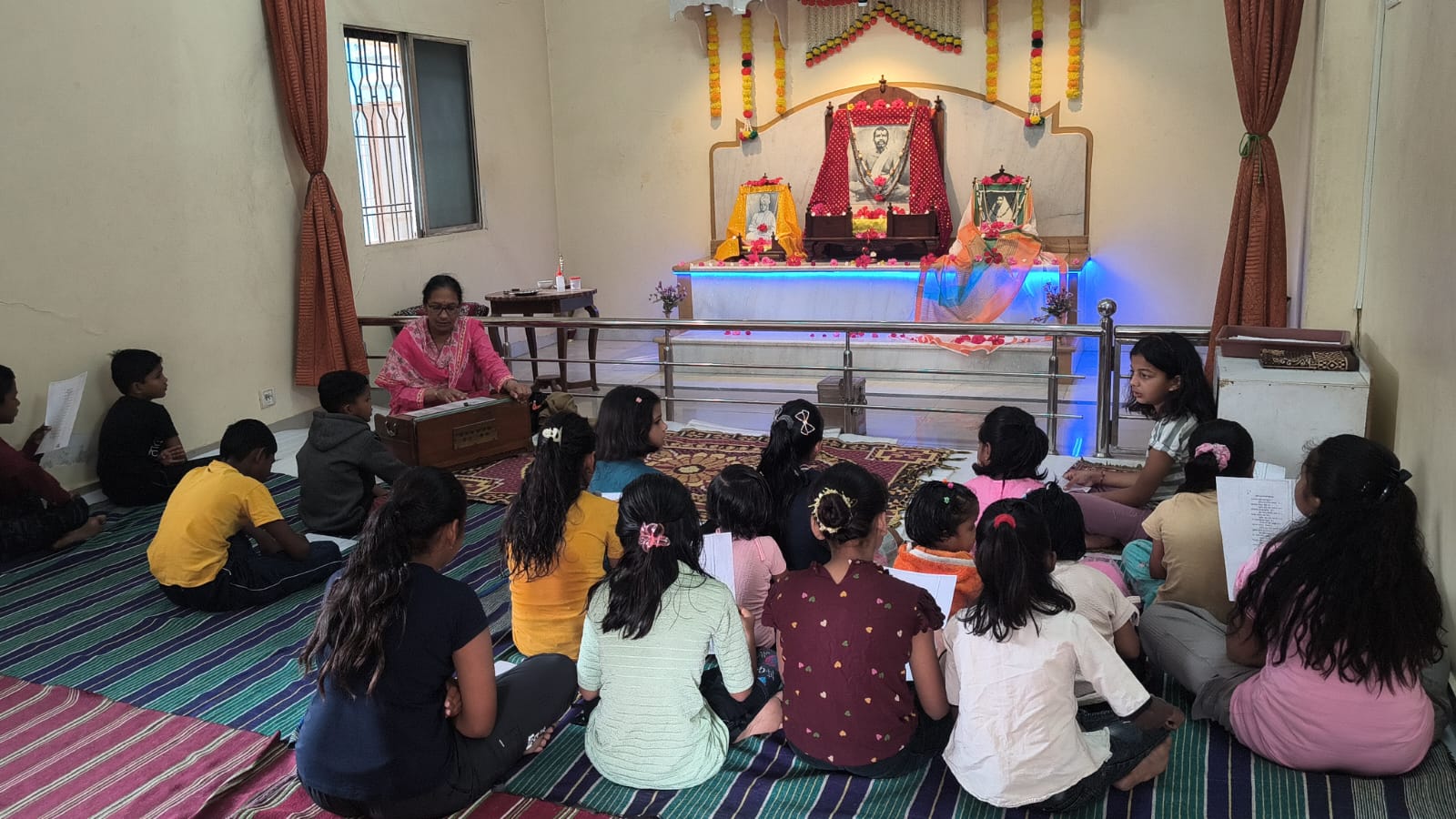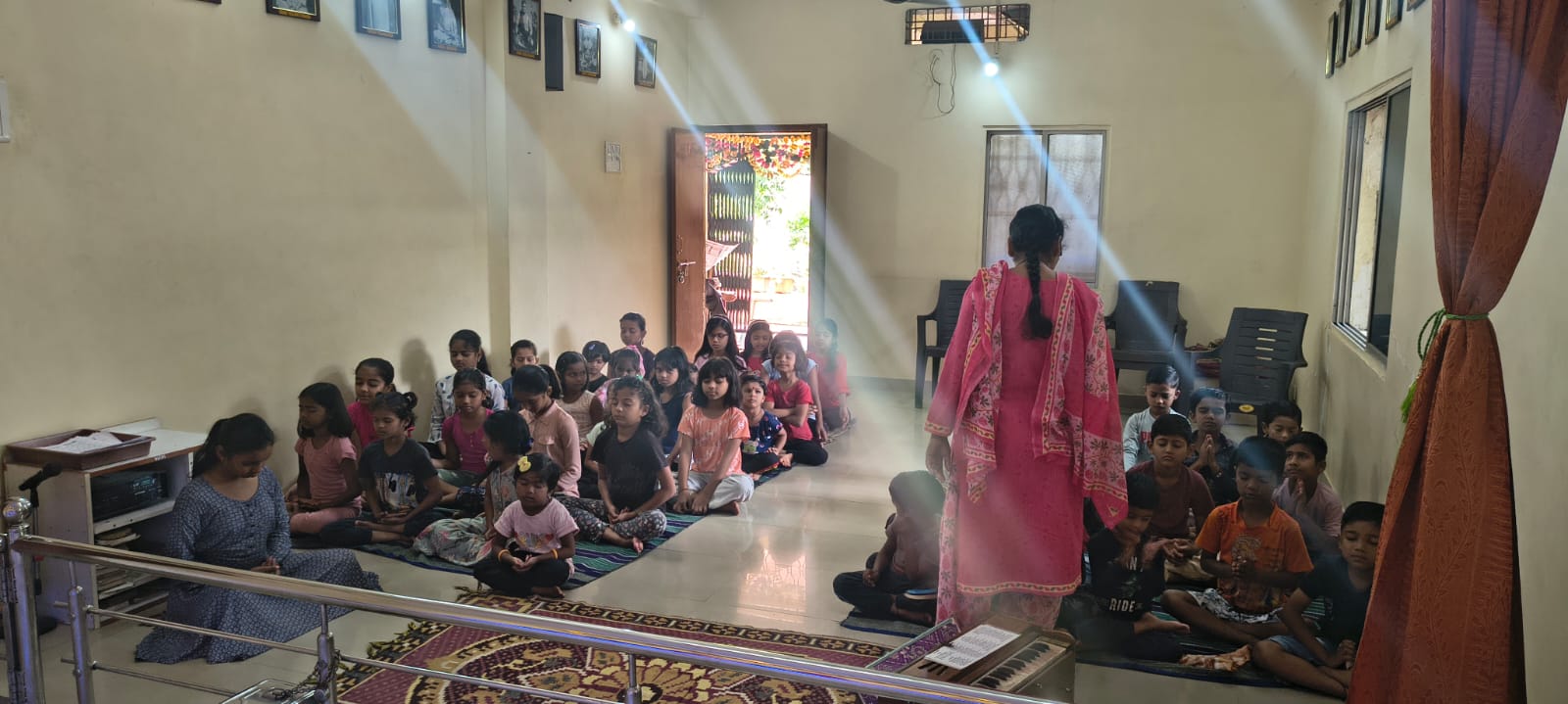 - Balak Sangha: For imparting moral and spiritual education to the school going children, the Balak Sangha of the Ashram holds classes for children on every Sunday morning. They are taught Chanting Hymns and Bhajans, Moral and Spiritual Story Telling, Yoga and Games etc. Children play dramas on the lives of Holy Trio on various occasions.