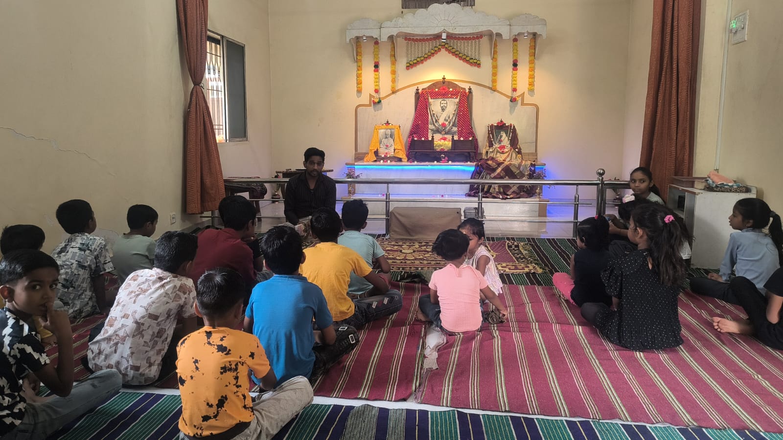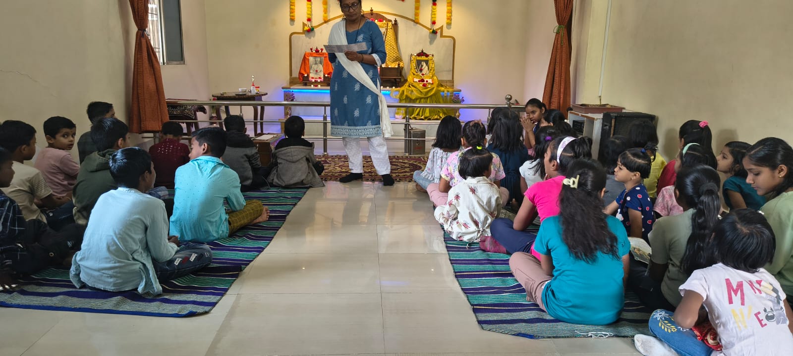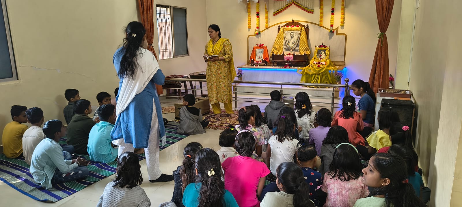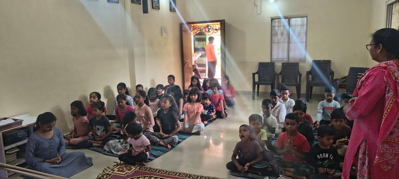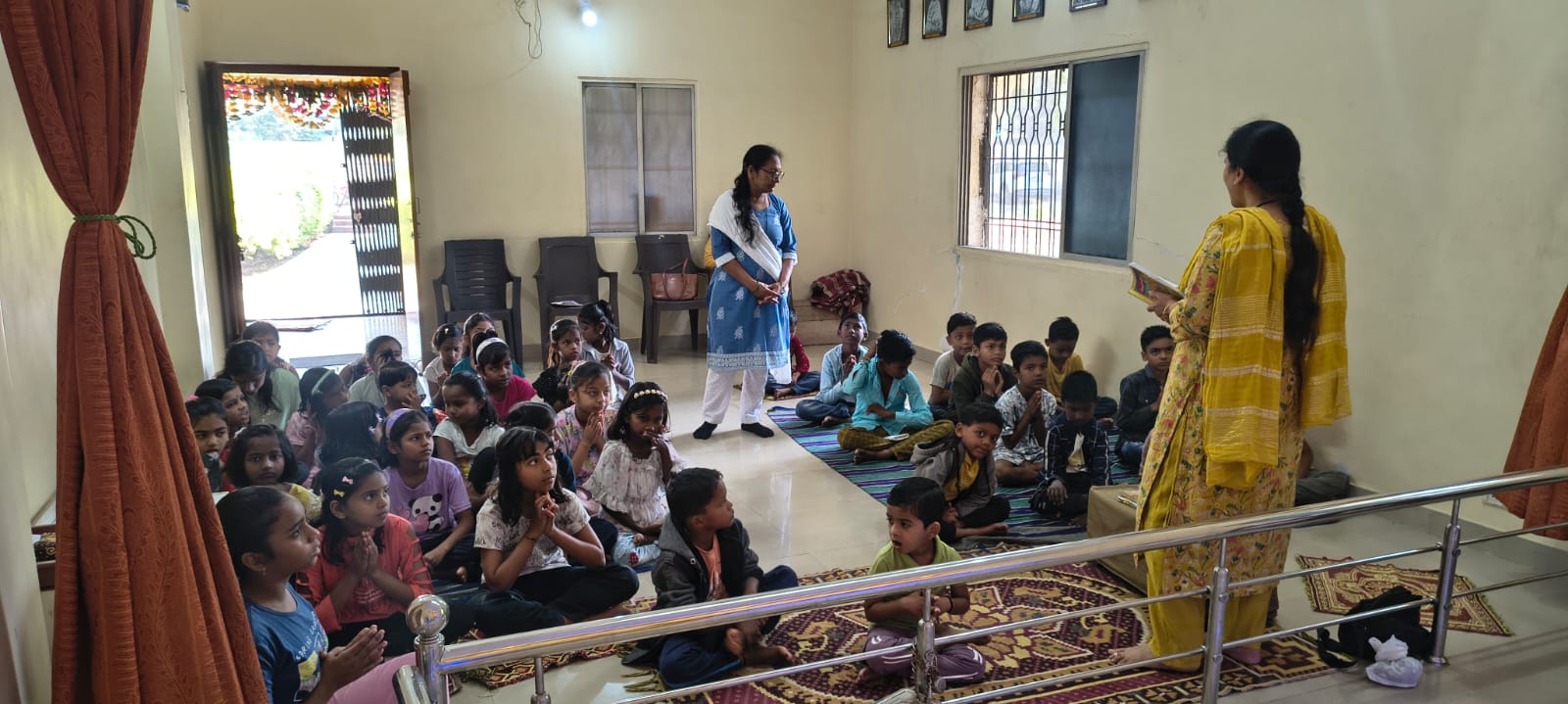 - Balak Sangha: For imparting moral and spiritual education to the school going children, the Balak Sangha of the Ashram holds classes for children on every Sunday morning. They are taught Chanting Hymns and Bhajans, Moral and Spiritual Story Telling, Yoga and Games etc. Children play dramas on the lives of Holy Trio on various occasions.