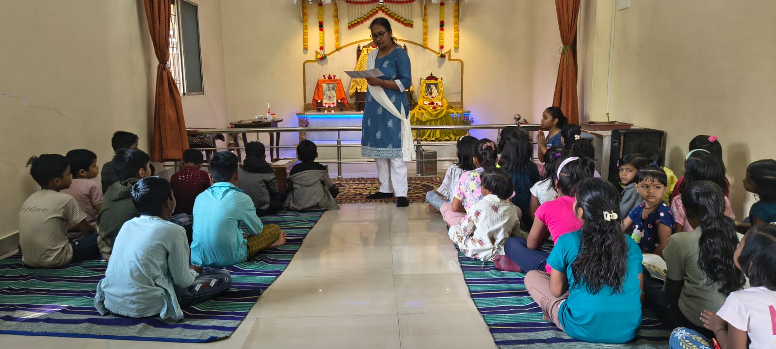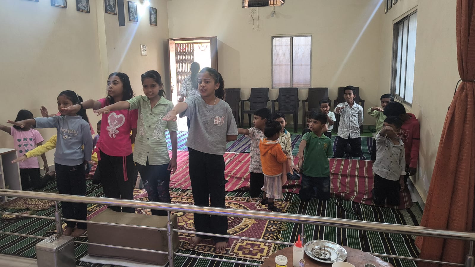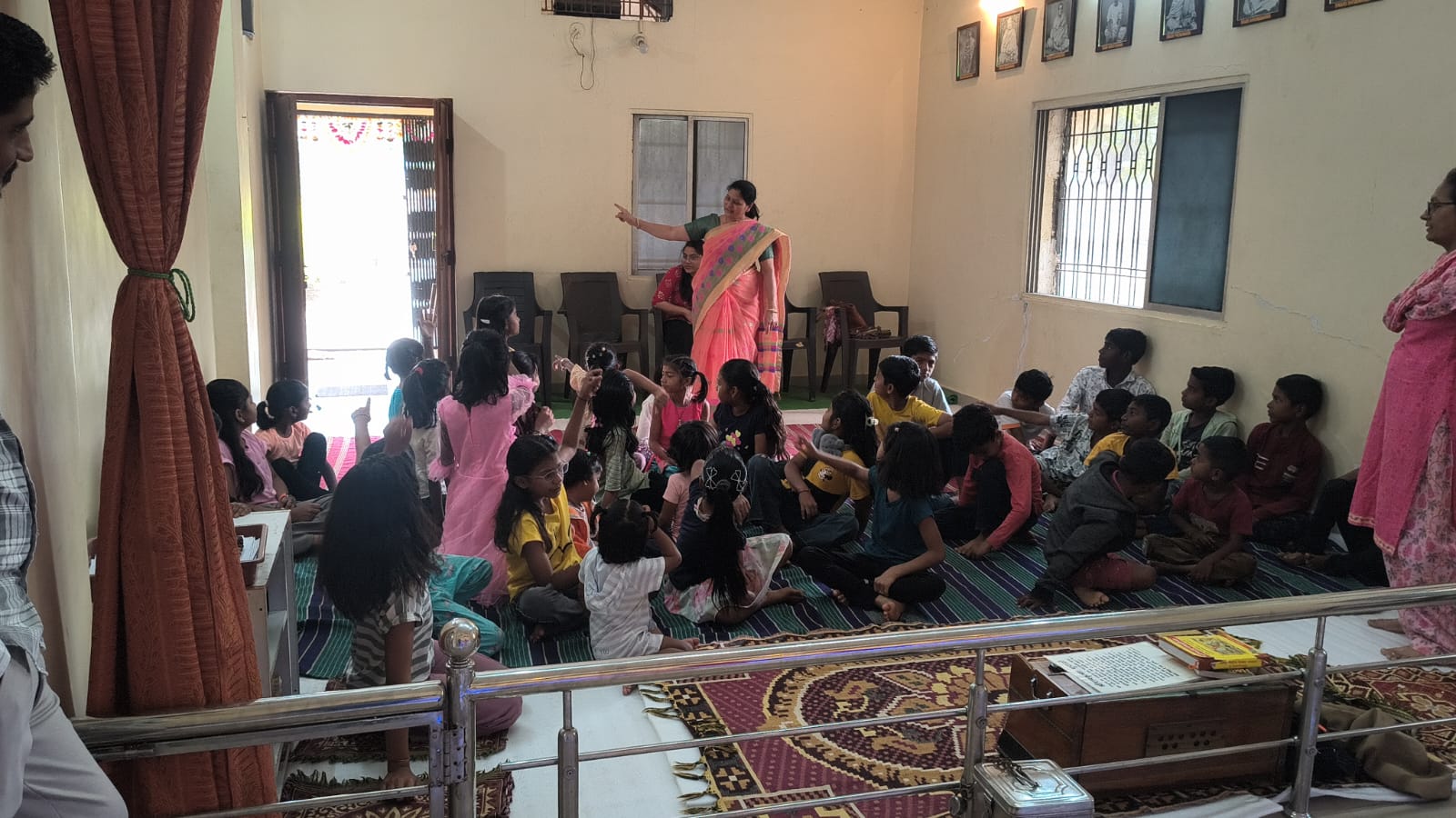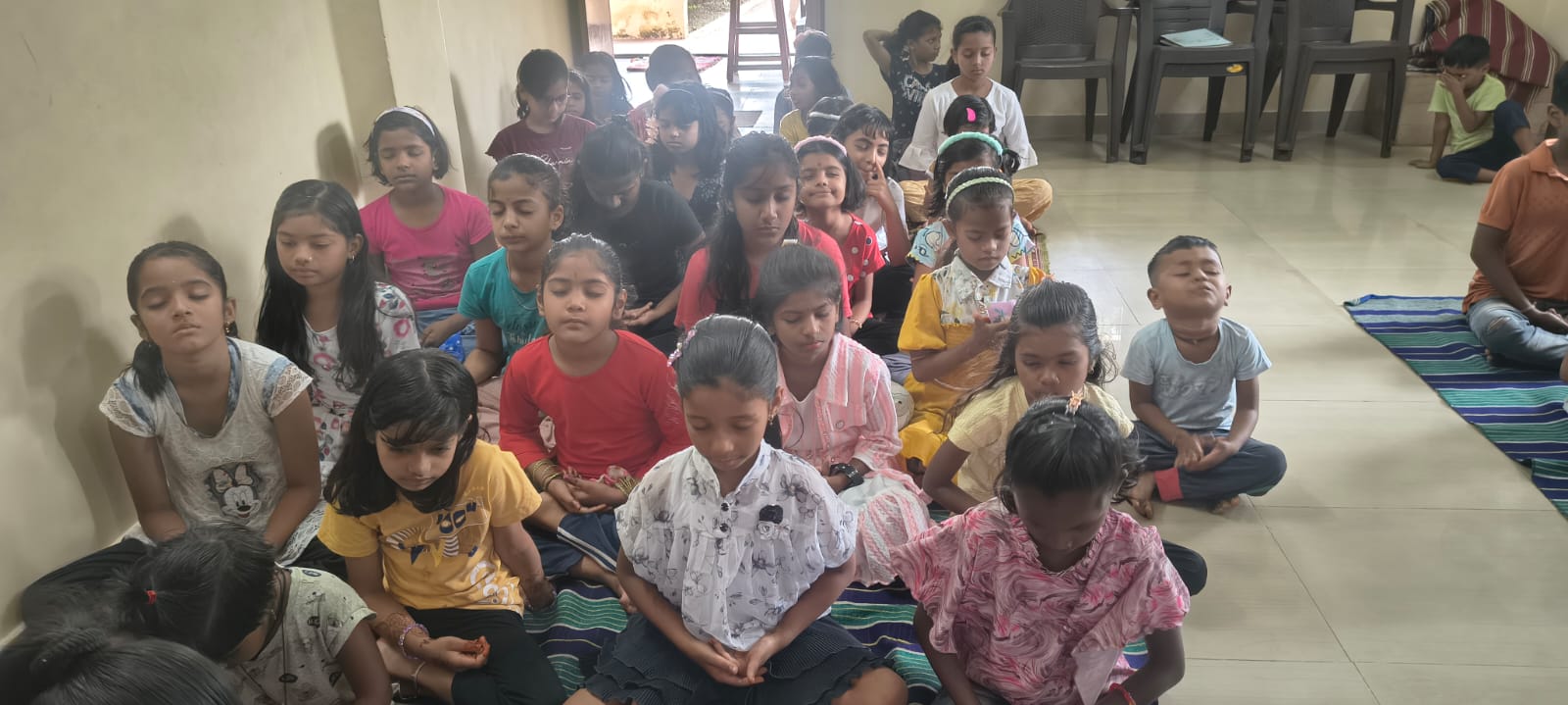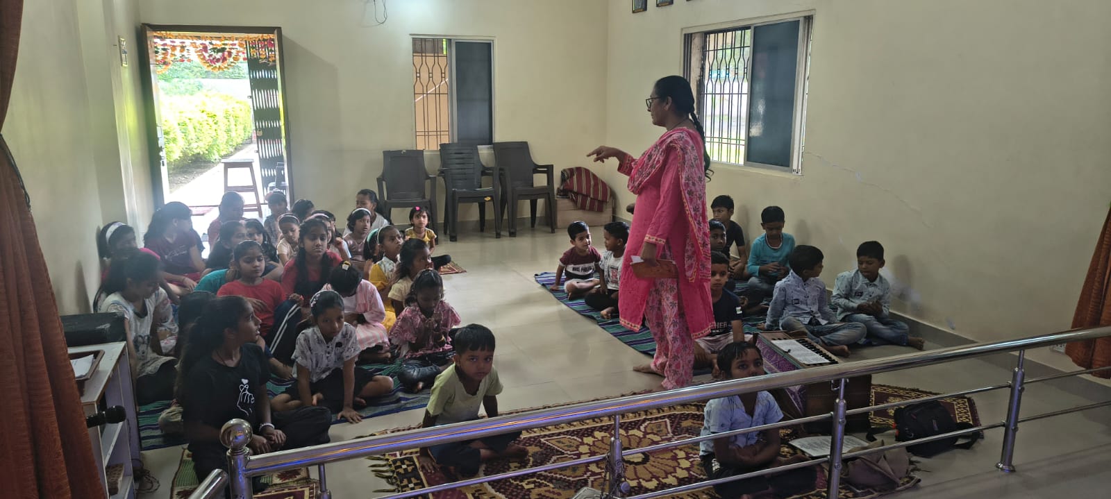 - Balak Sangha: For imparting moral and spiritual education to the school going children, the Balak Sangha of the Ashram holds classes for children on every Sunday morning. They are taught Chanting Hymns and Bhajans, Moral and Spiritual Story Telling, Yoga and Games etc. Children play dramas on the lives of Holy Trio on various occasions.