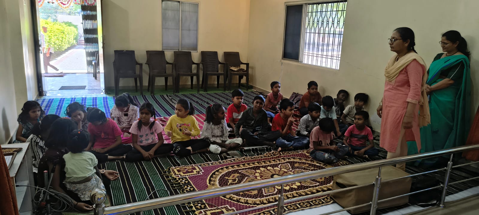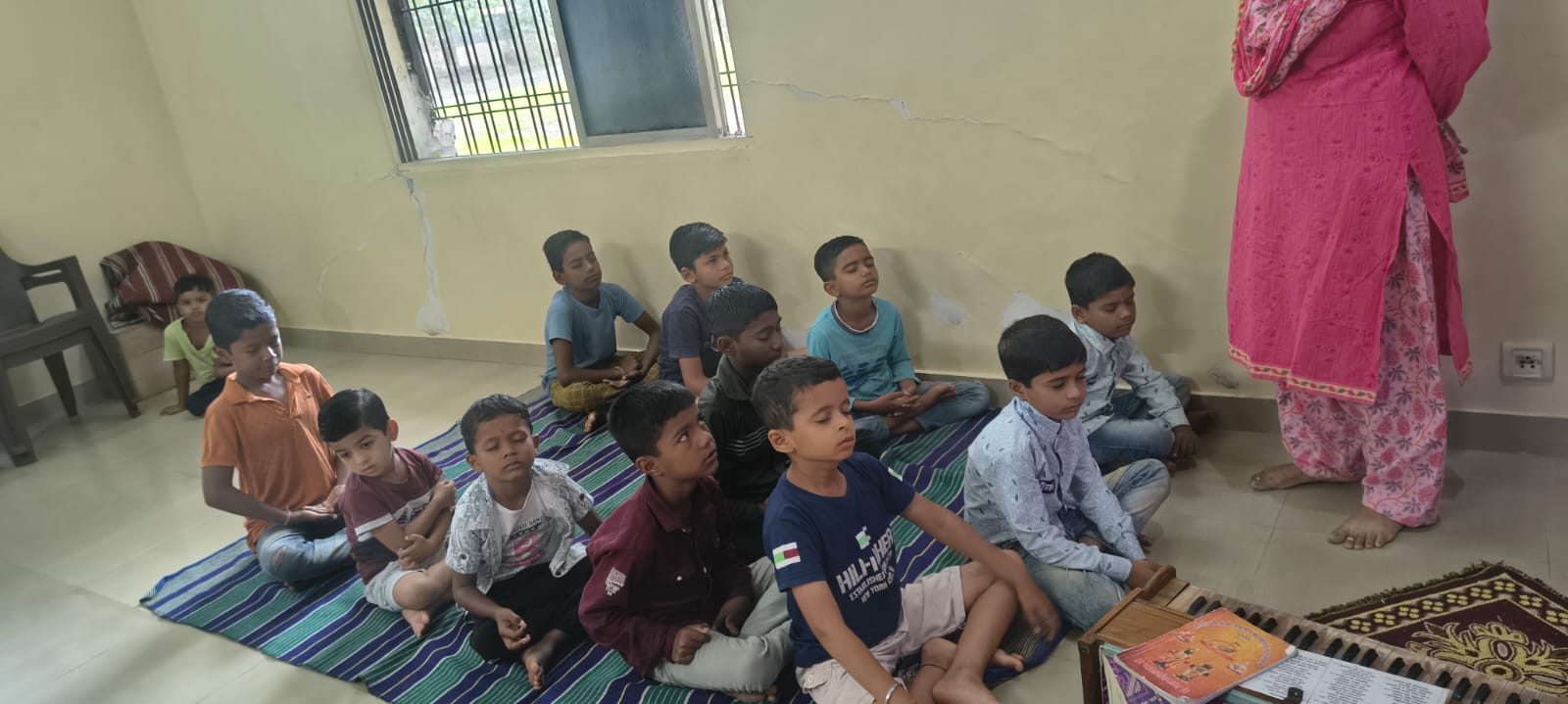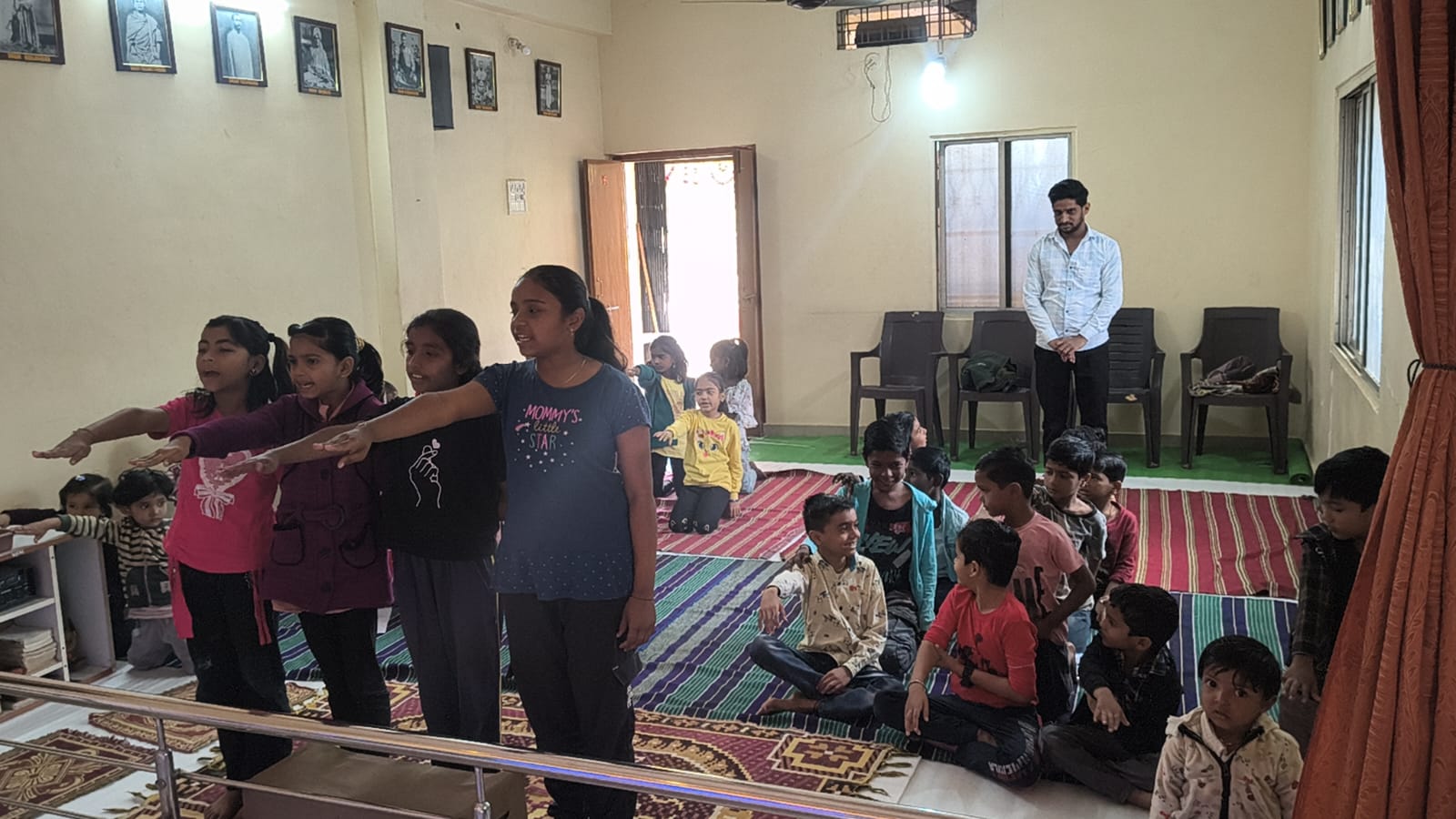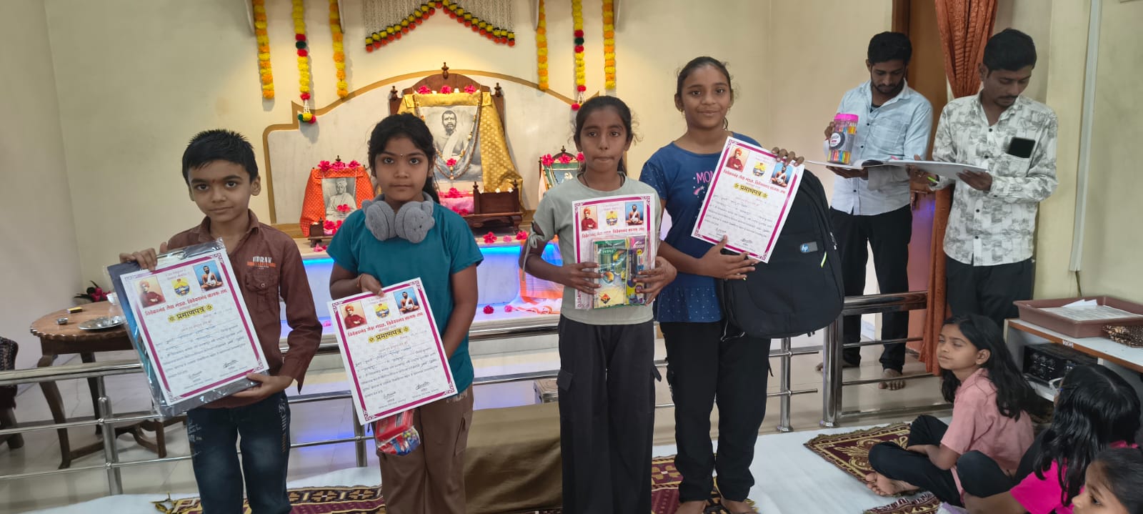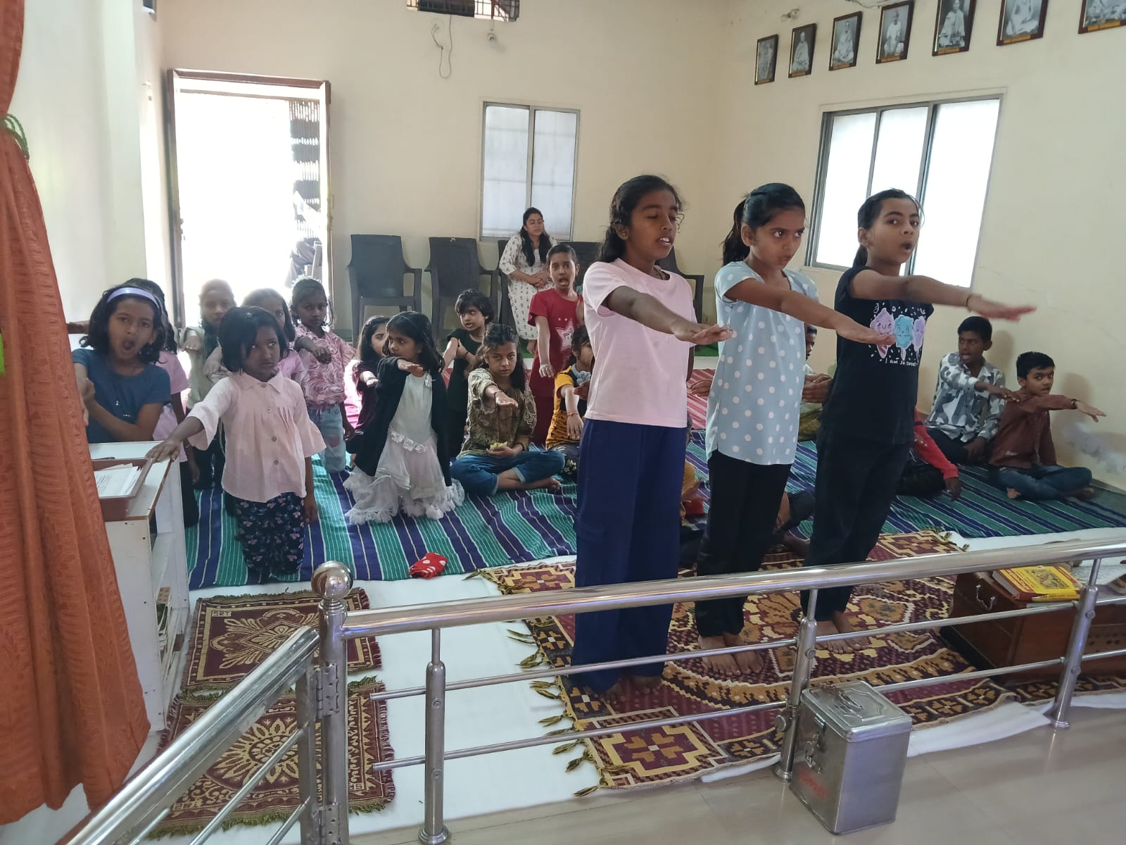 - Balak Sangha: For imparting moral and spiritual education to the school going children, the Balak Sangha of the Ashram holds classes for children on every Sunday morning. They are taught Chanting Hymns and Bhajans, Moral and Spiritual Story Telling, Yoga and Games etc. Children play dramas on the lives of Holy Trio on various occasions.