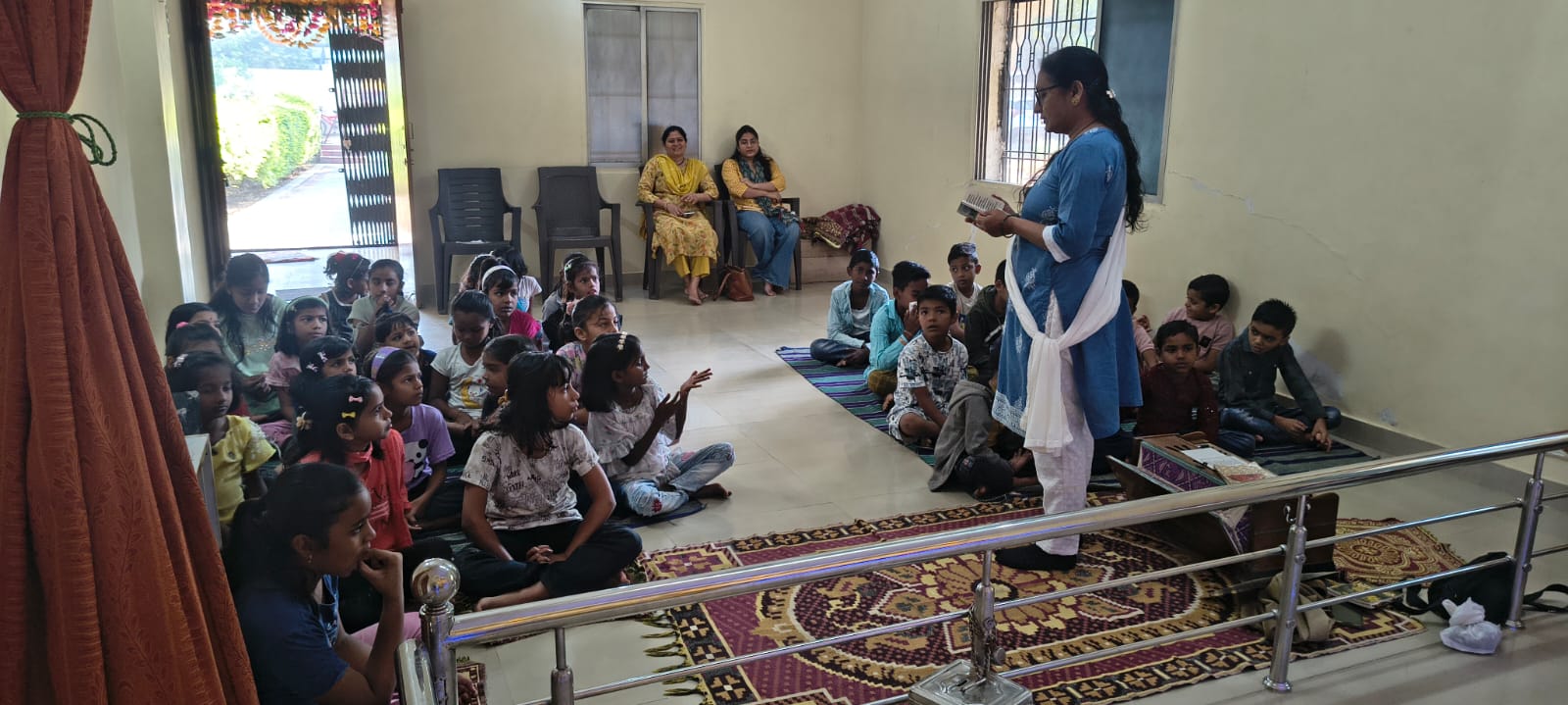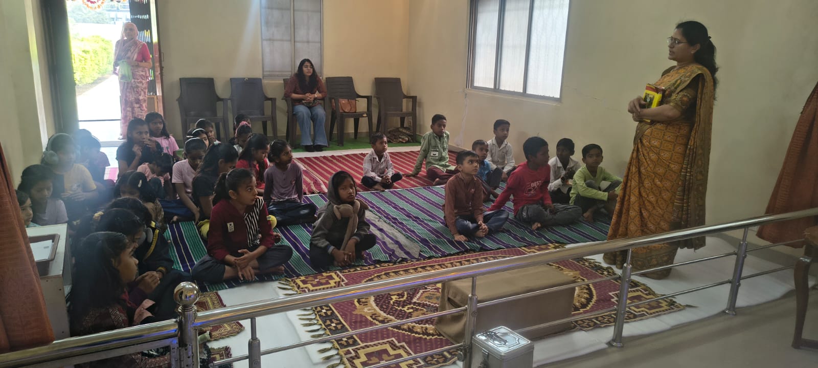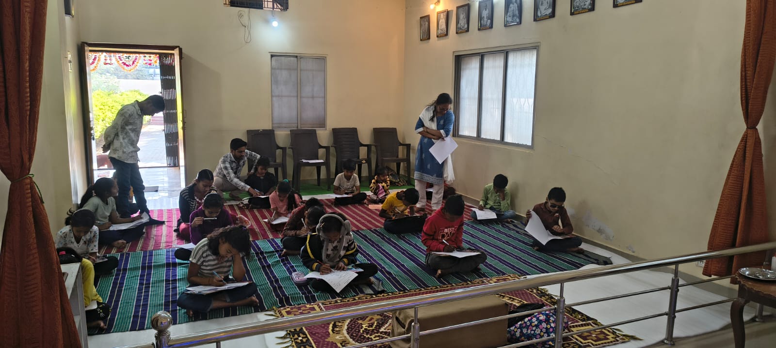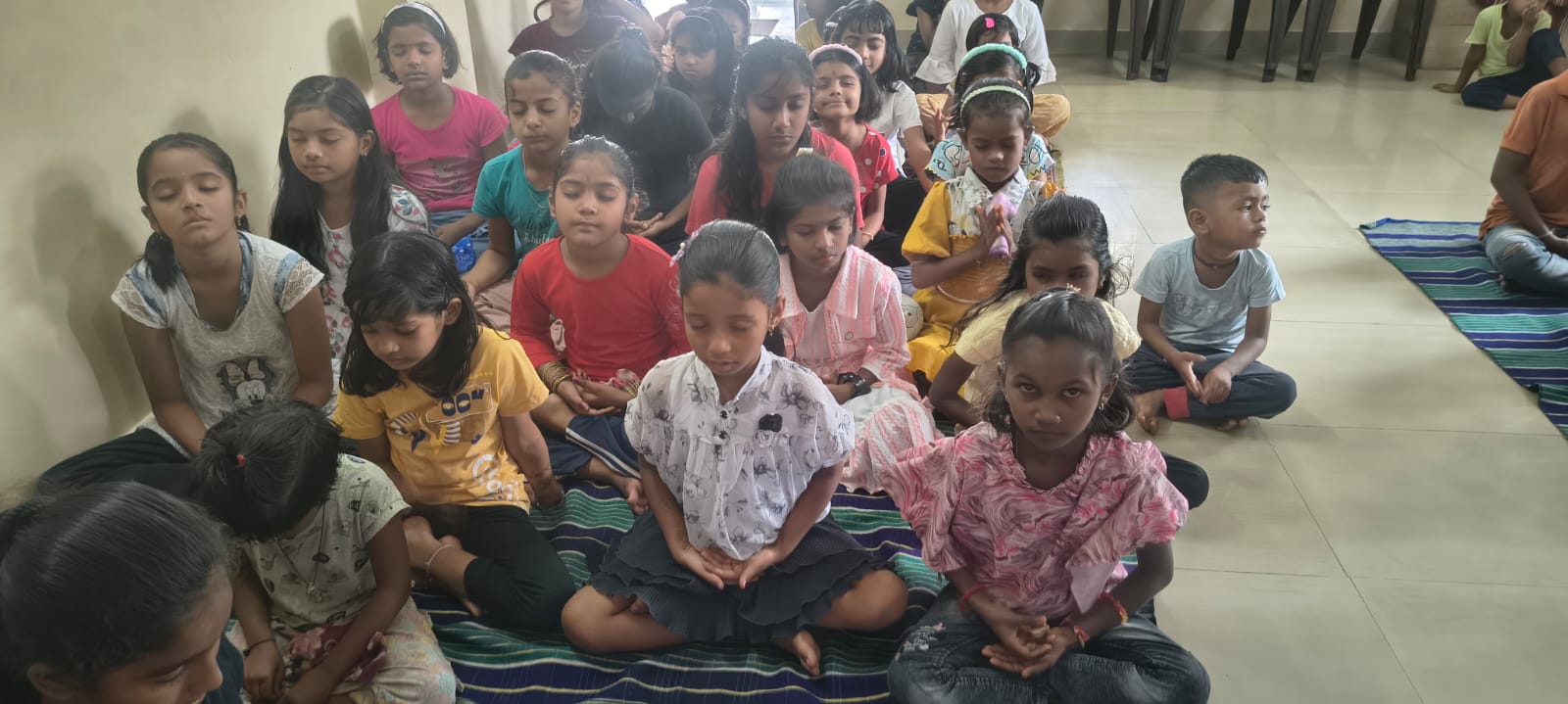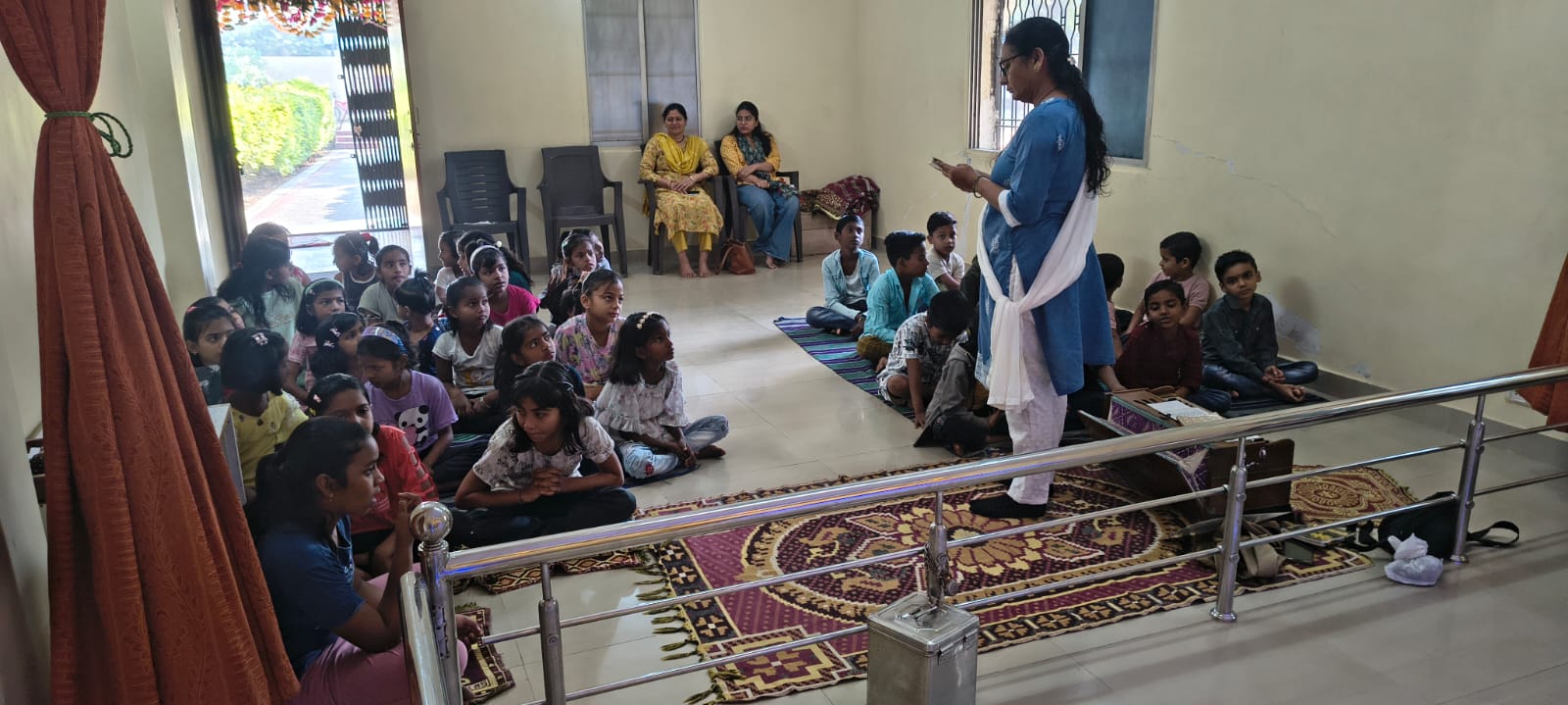- Balak Sangha: For imparting moral and spiritual education to the school going children, the Balak Sangha of the Ashram holds classes for children on every Sunday morning. They are taught Chanting Hymns and Bhajans, Moral and Spiritual Story Telling, Yoga and Games etc. Children play dramas on the lives of Holy Trio on various occasions.