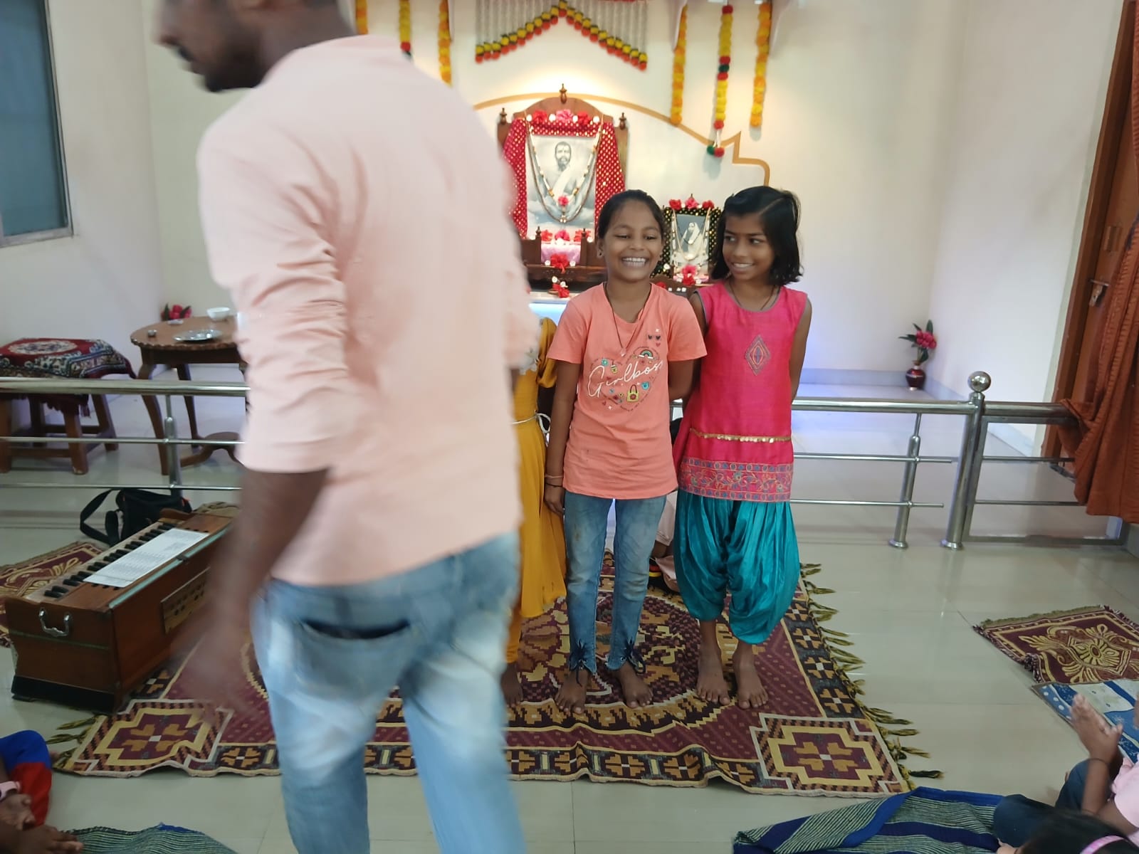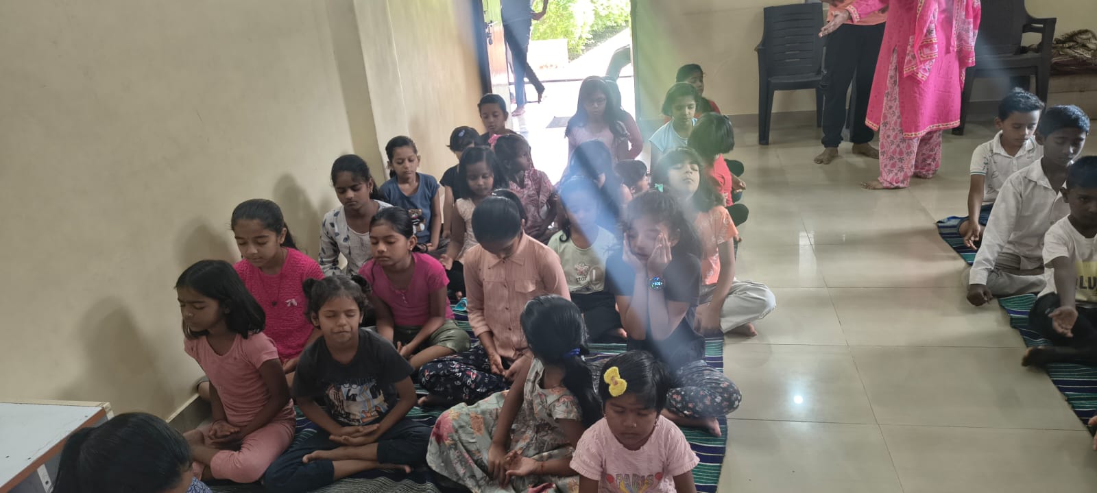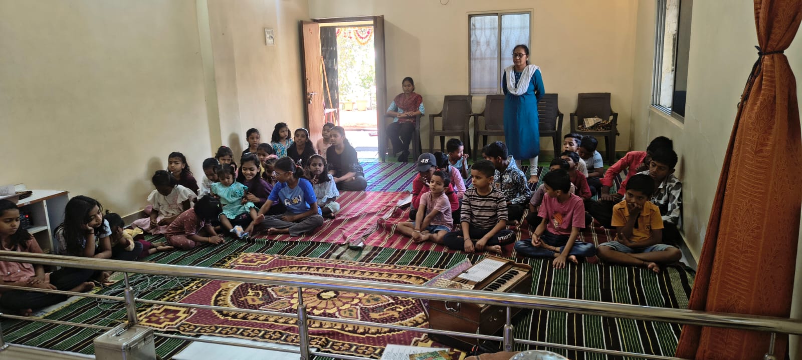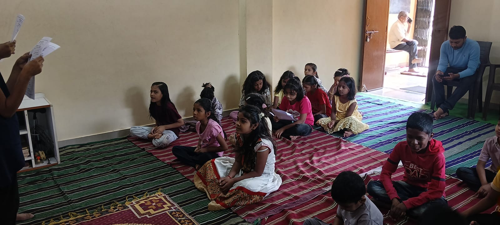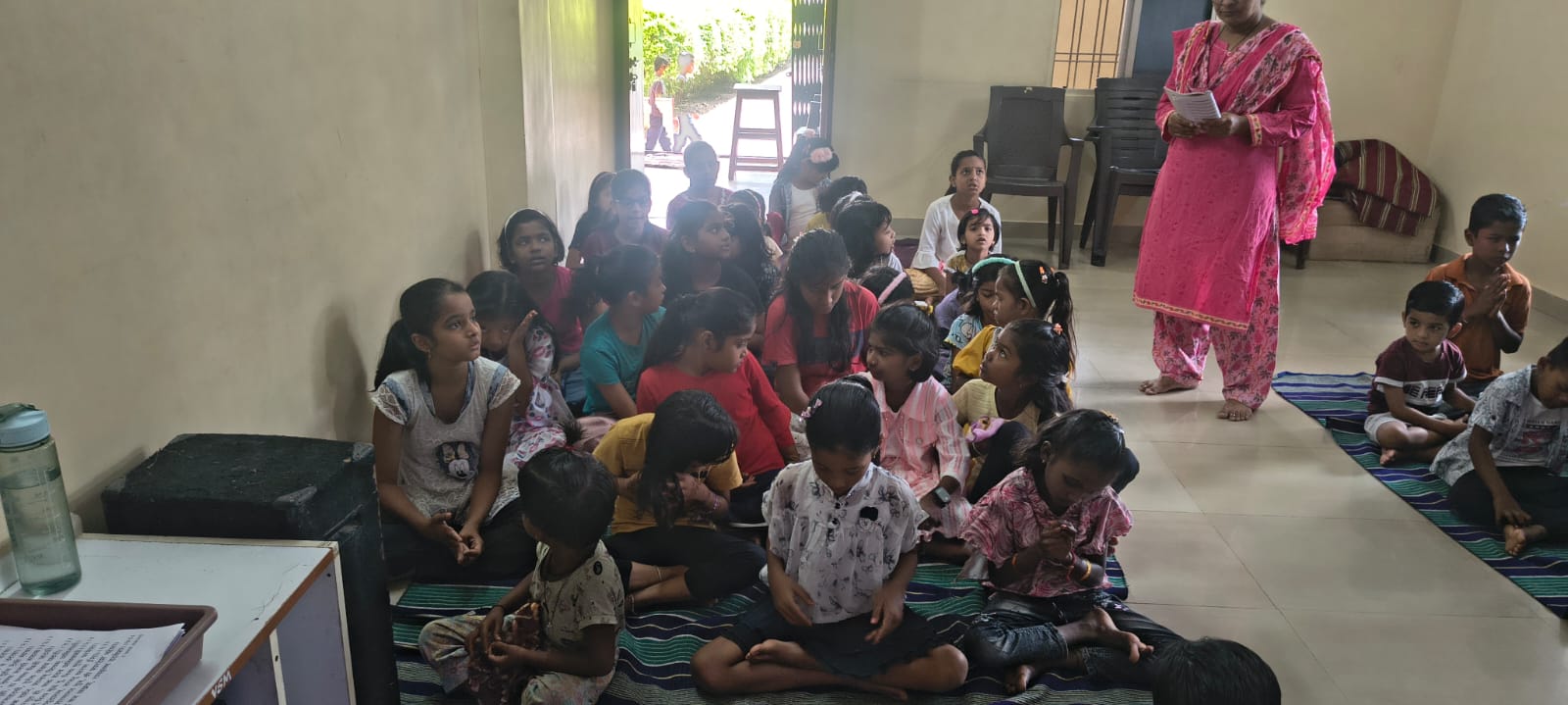 - Balak Sangha: For imparting moral and spiritual education to the school going children, the Balak Sangha of the Ashram holds classes for children on every Sunday morning. They are taught Chanting Hymns and Bhajans, Moral and Spiritual Story Telling, Yoga and Games etc. Children play dramas on the lives of Holy Trio on various occasions.